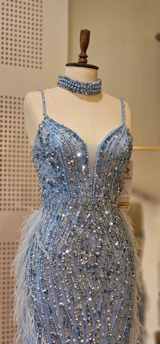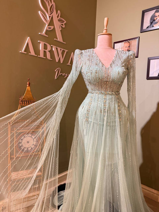 يتم تصنيع كل فستان من فساتين أروى يدويًا بإتقان - حيث تتجمع الأقمشة الفاخرة والزخارف الكريستالية والريش الرقيق معًا لتقدم لنا قطعة لا تُنسى.