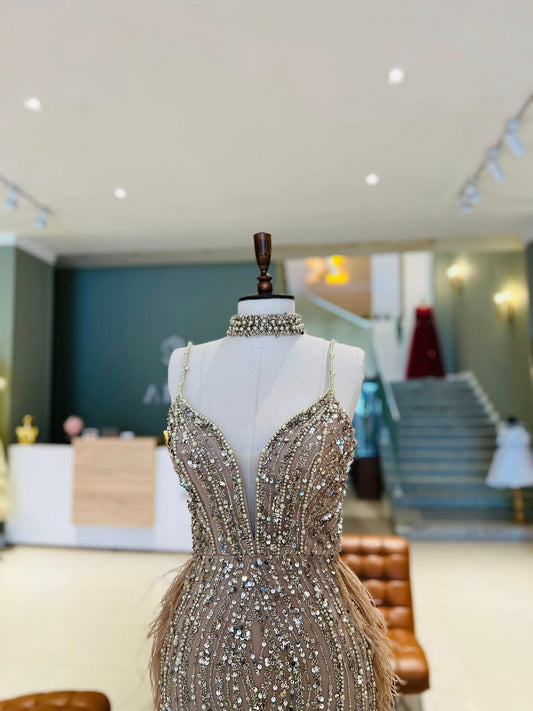 يتم تصنيع كل فستان من فساتين أروى يدويًا بإتقان - حيث تتجمع الأقمشة الفاخرة والزخارف الكريستالية والريش الرقيق معًا لتقدم لنا قطعة لا تُنسى.