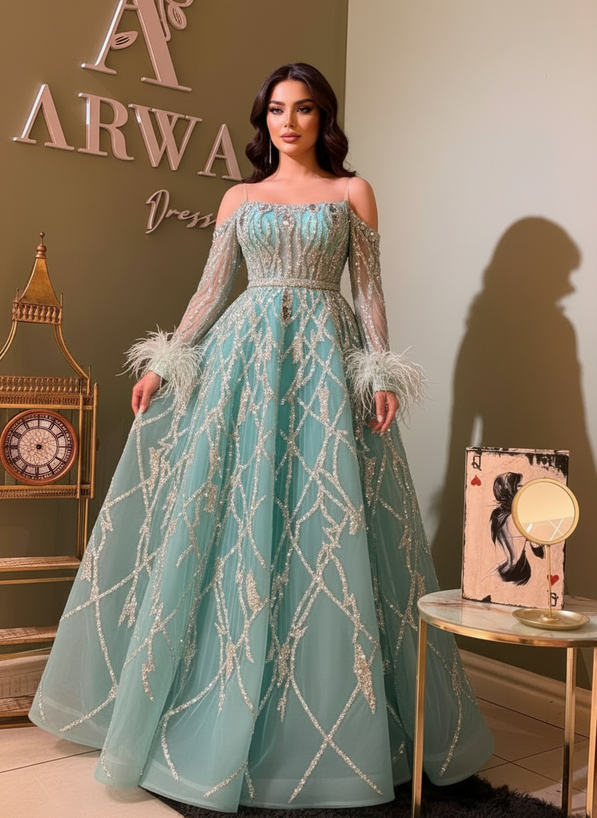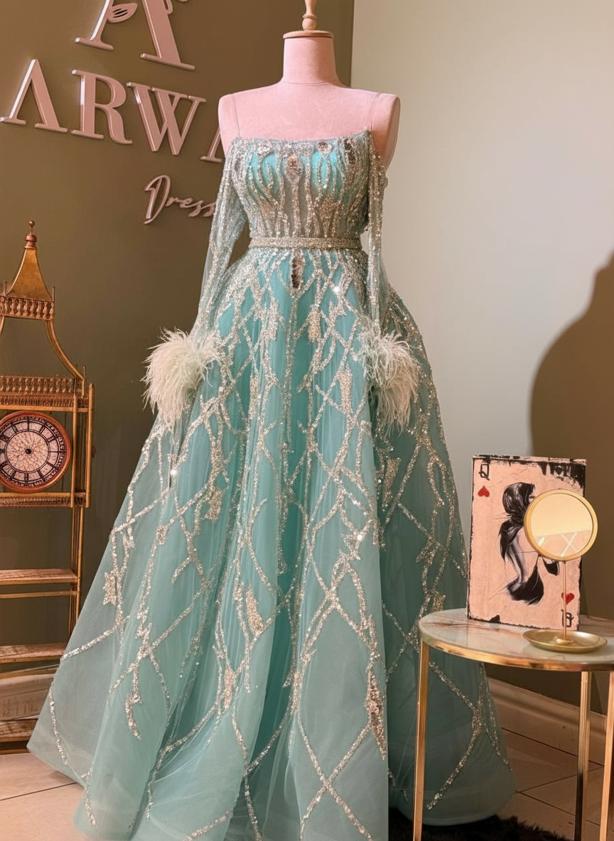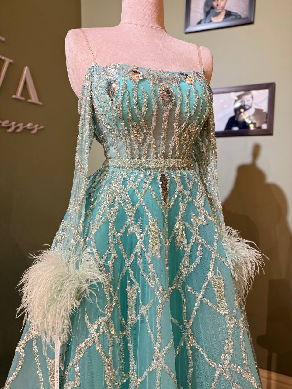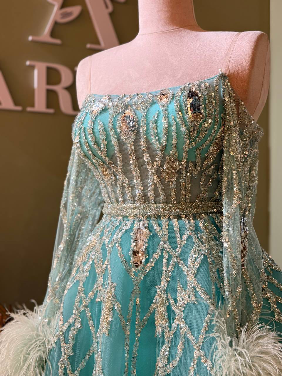 فستان أكوا ستاردست هو تصميم راقي مبهر بلون فيروزي أخاذ. يتميز بصدرية ضيقة مرصعة بالكريستال، وياقة مربعة ناعمة، وأكمام أنيقة منسدلة مزينة بلمسات من الريش.