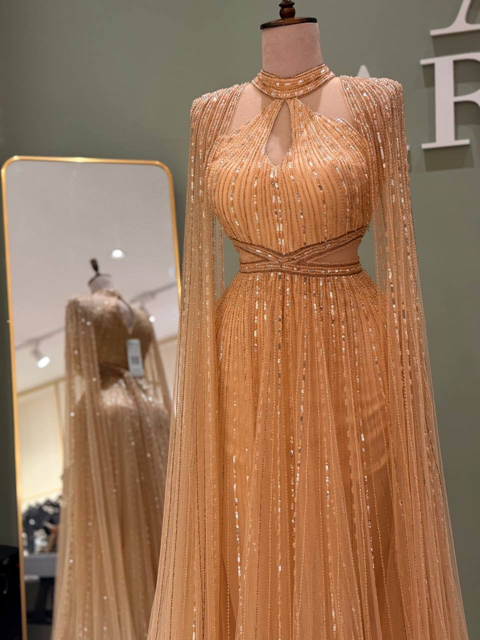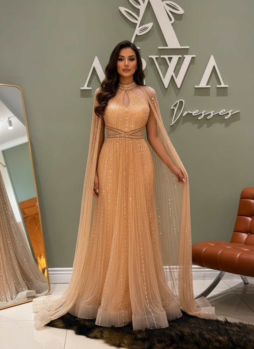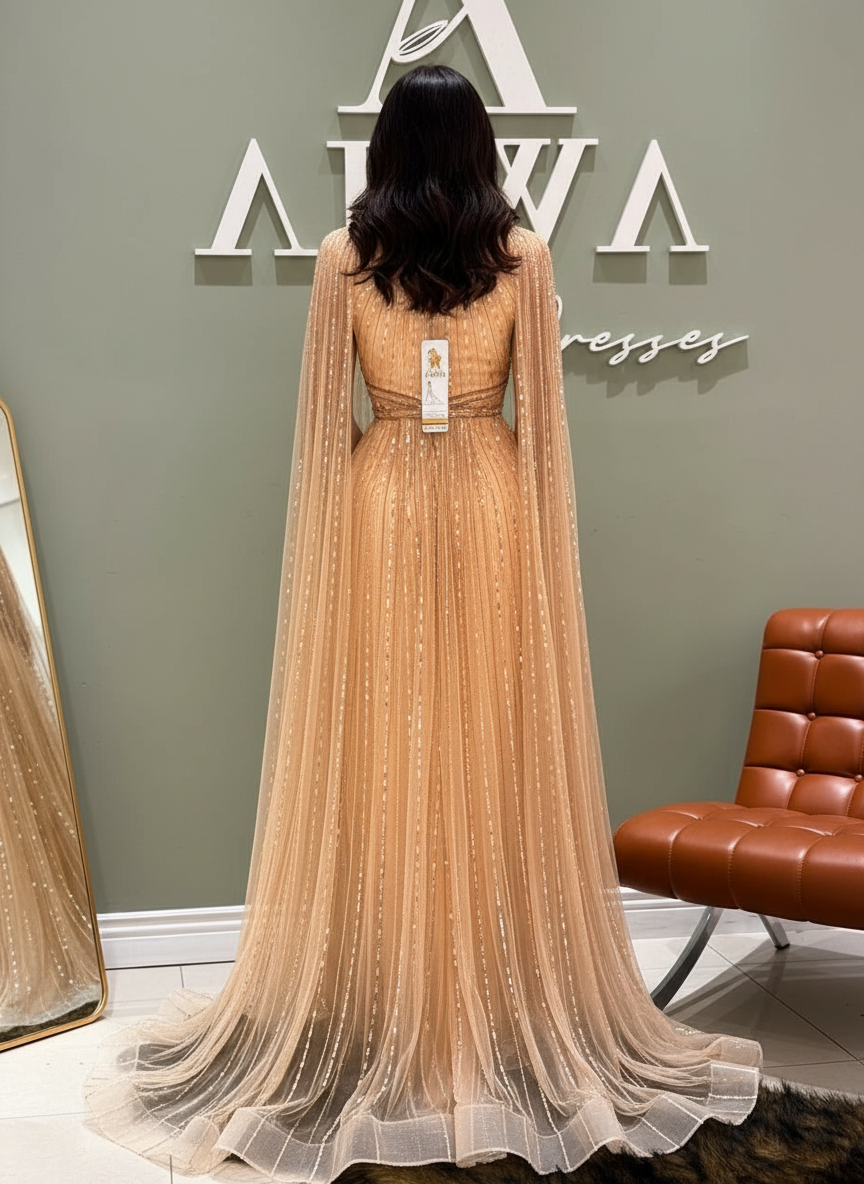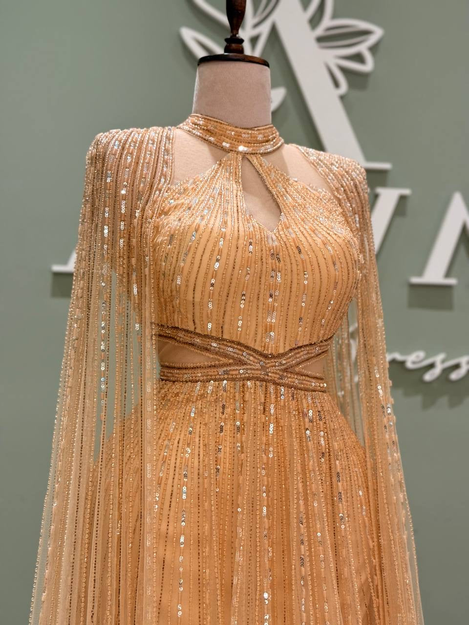 فستان " غولدن أورا" يشعّ أناقةً بلونه الذهبي الناعم وتصميمه الرقيق. قطعةٌ خالدةٌ مصممةٌ لحفلات الخطوبة والمناسبات المسائية والاحتفالات الفاخرة.