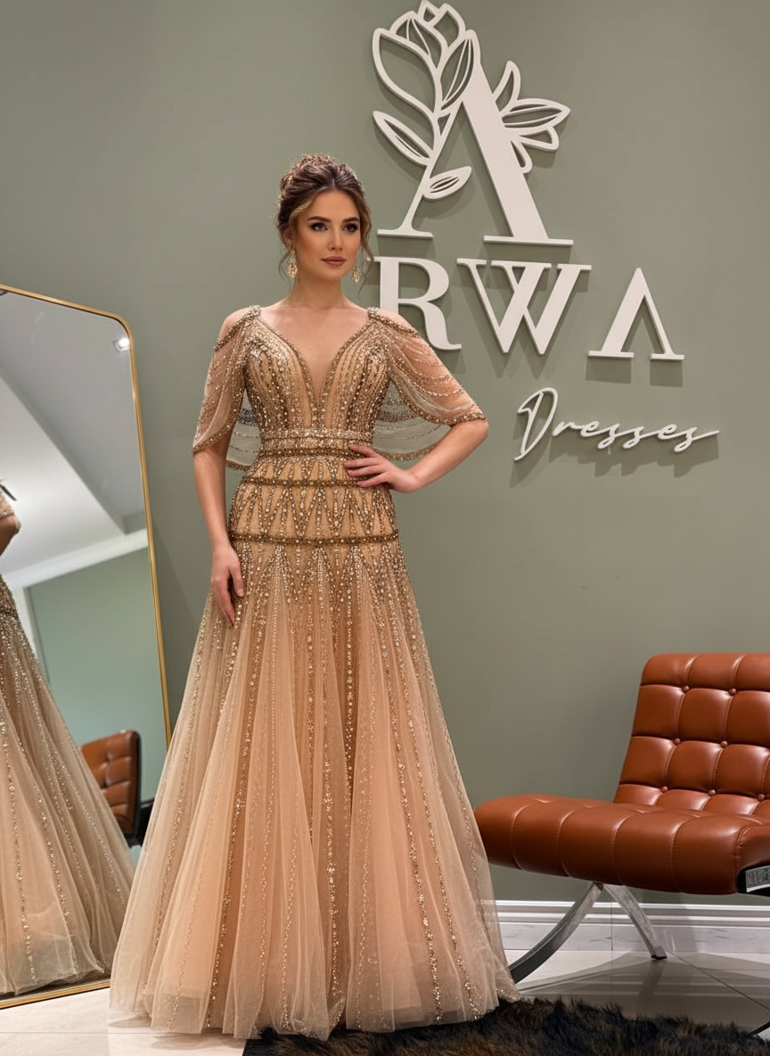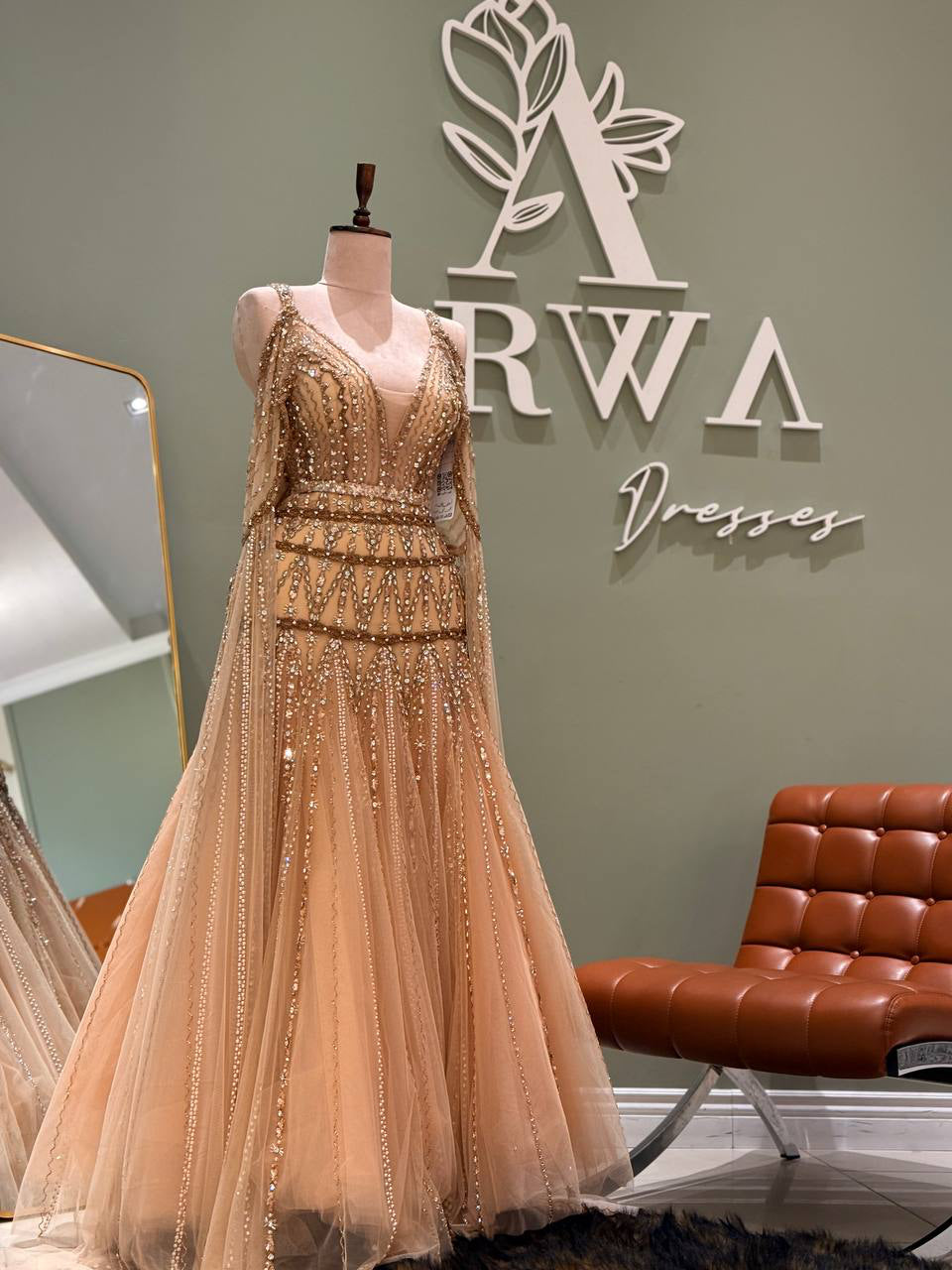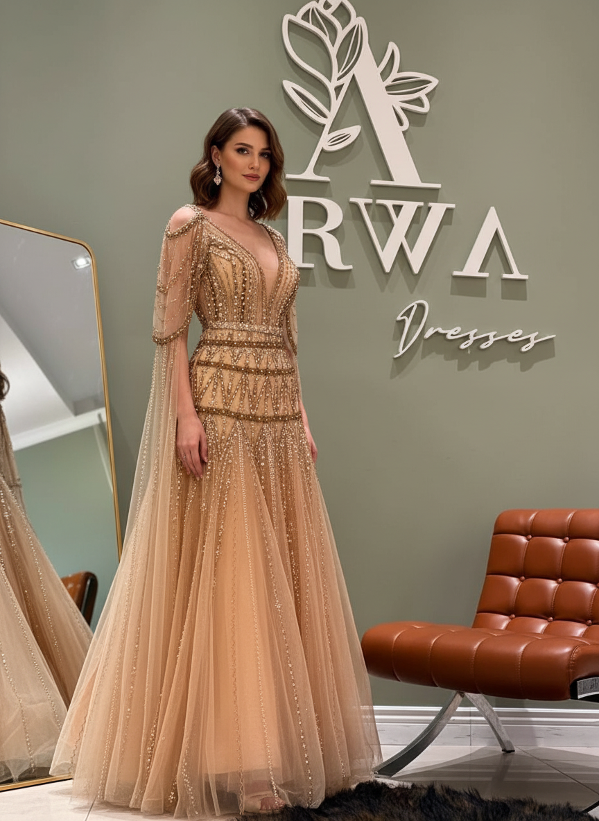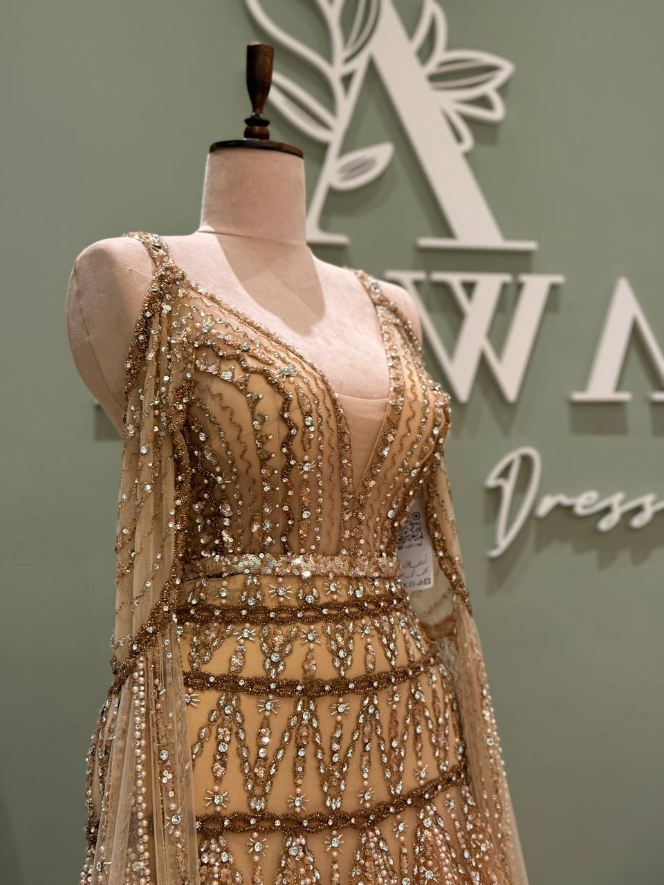 يمزج فستان "غولدن هارموني" بين الأناقة والرقي العصري، بلونه الشامبانيا الناعم وتطريزه اليدوي الدقيق بالخرز. يتميز الفستان بفتحة رقبة عميقة على شكل حرف V، وخصر منحوت، وأكمام منسدلة بدقة، مما يضفي عليه لمسة أنثوية أنيقة.