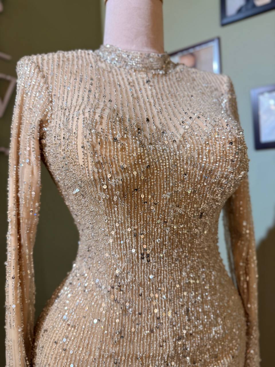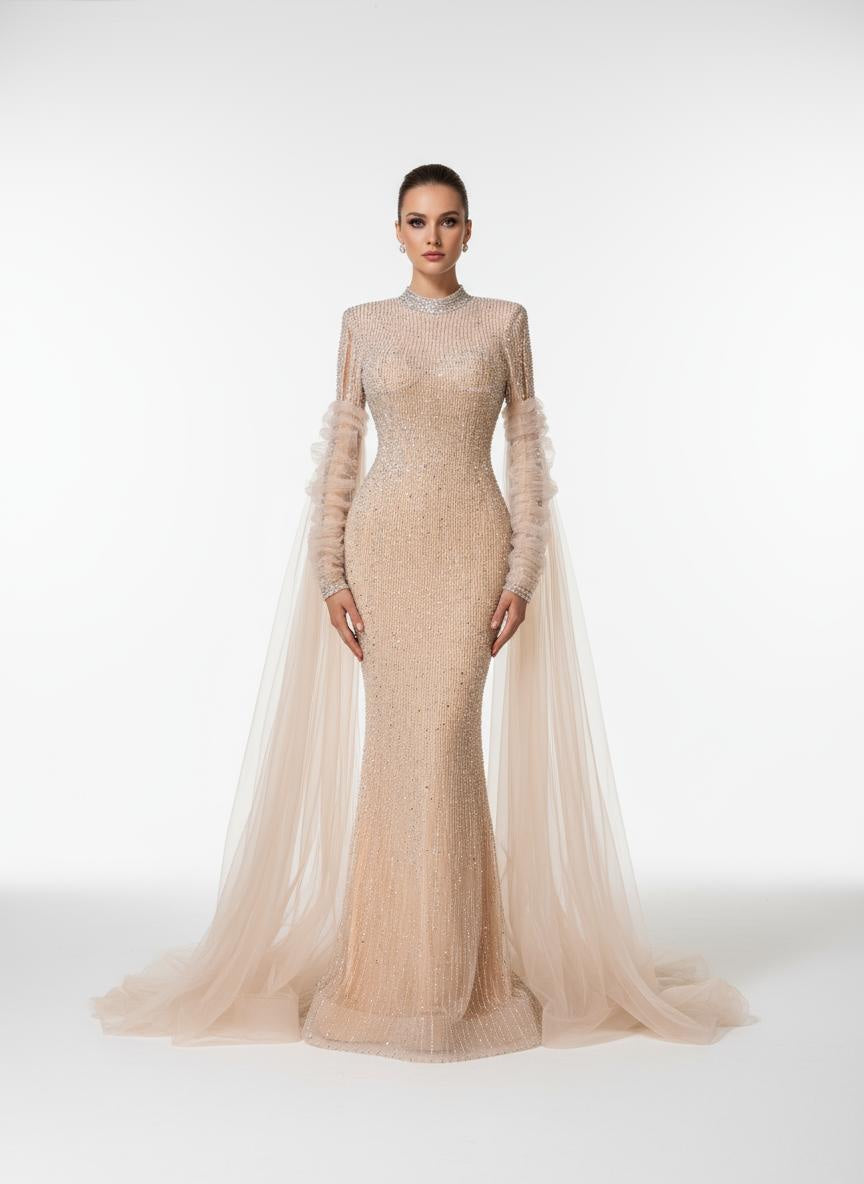 حوّلي كل لحظة إلى تعبير مميز مع فستاننا الذهبي المتألق - تحفة فنية تجمع بين الأناقة والرقي. يتميز هذا الفستان المسائي الضيق بتفاصيل دقيقة مطرزة يدويًا بالخرز تتألق مع كل حركة.