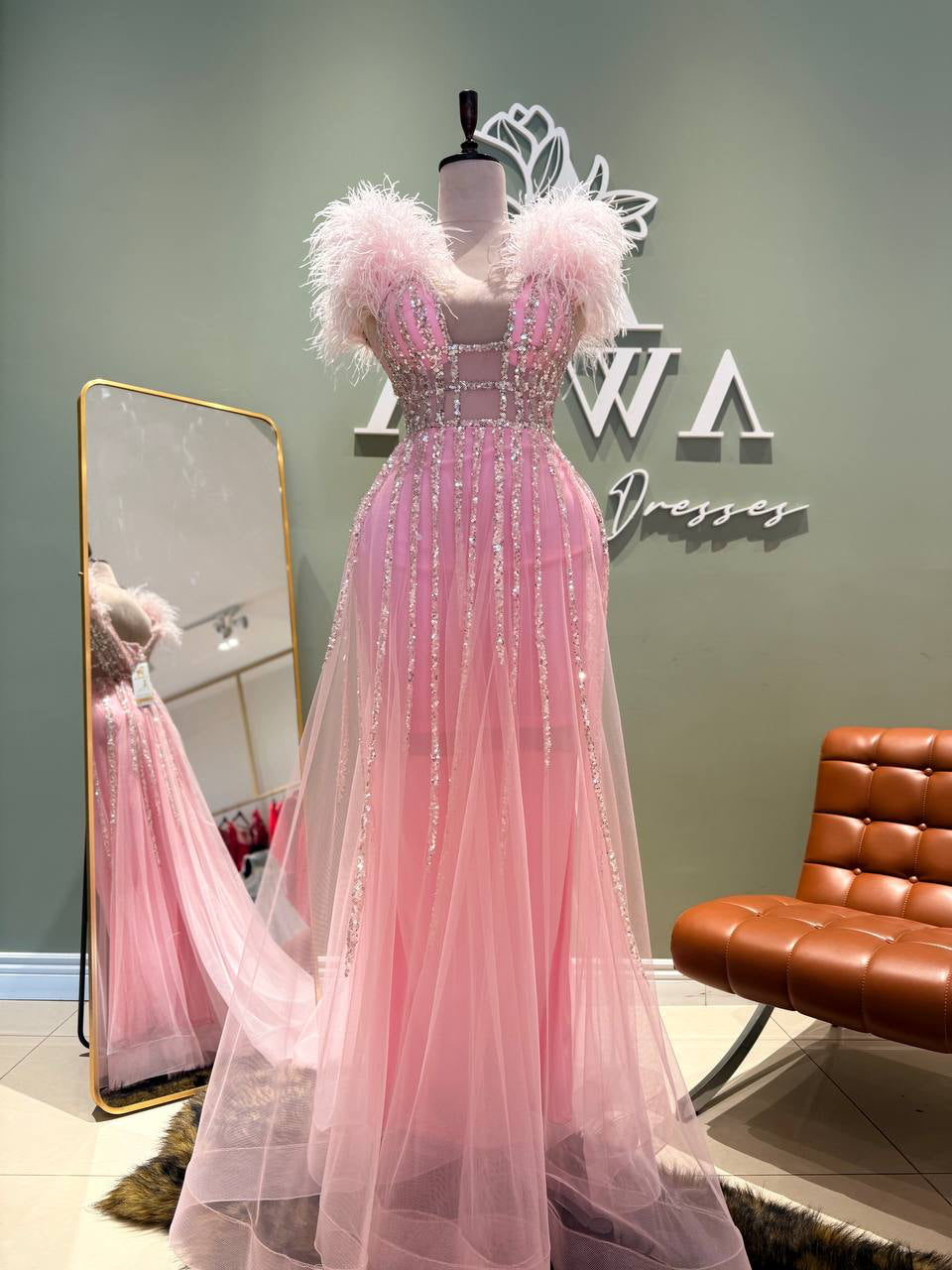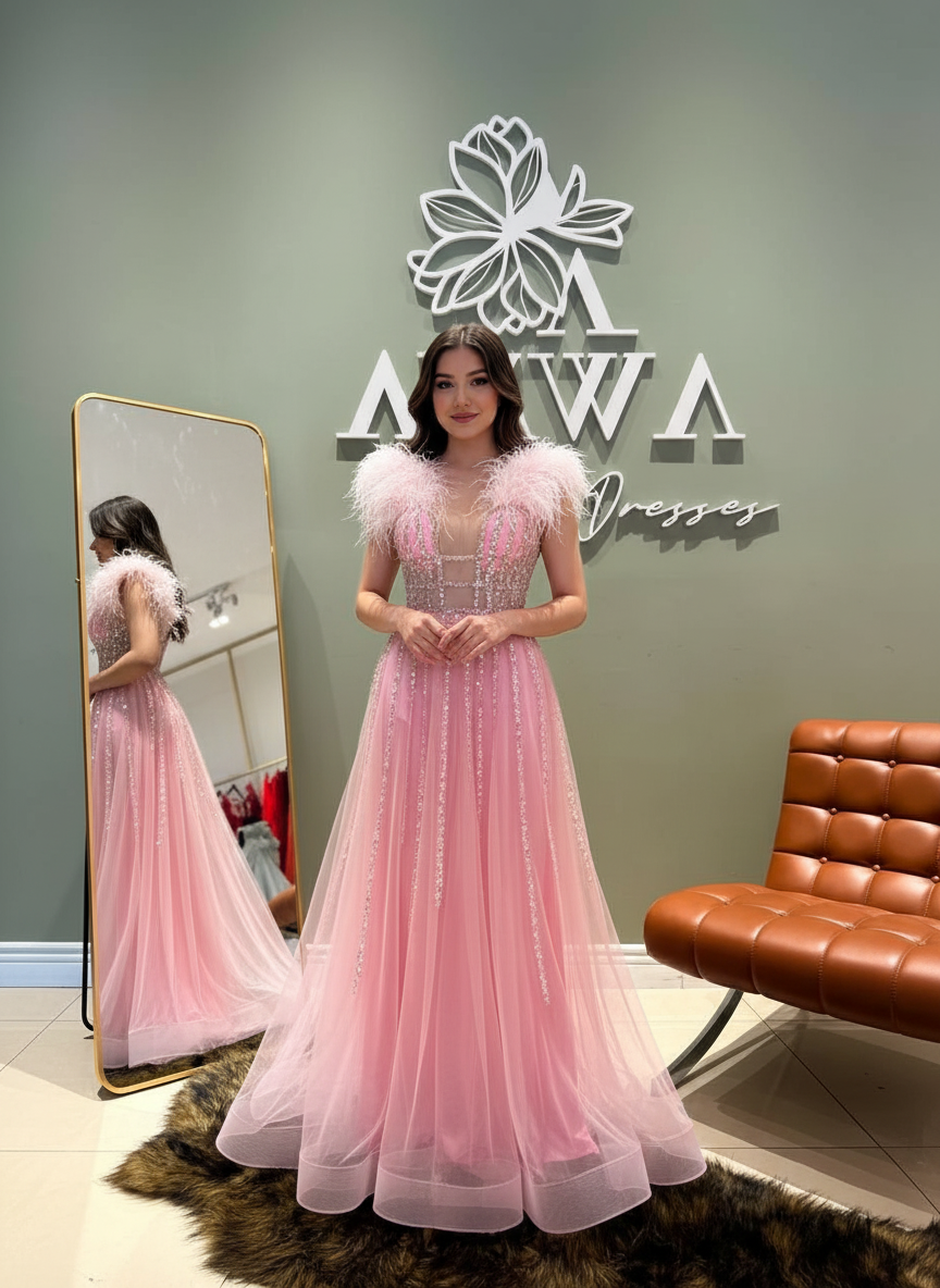 فستان Rose Feather Elegance هو تصميم راقي جذاب مصنوع من لون وردي ناعم.