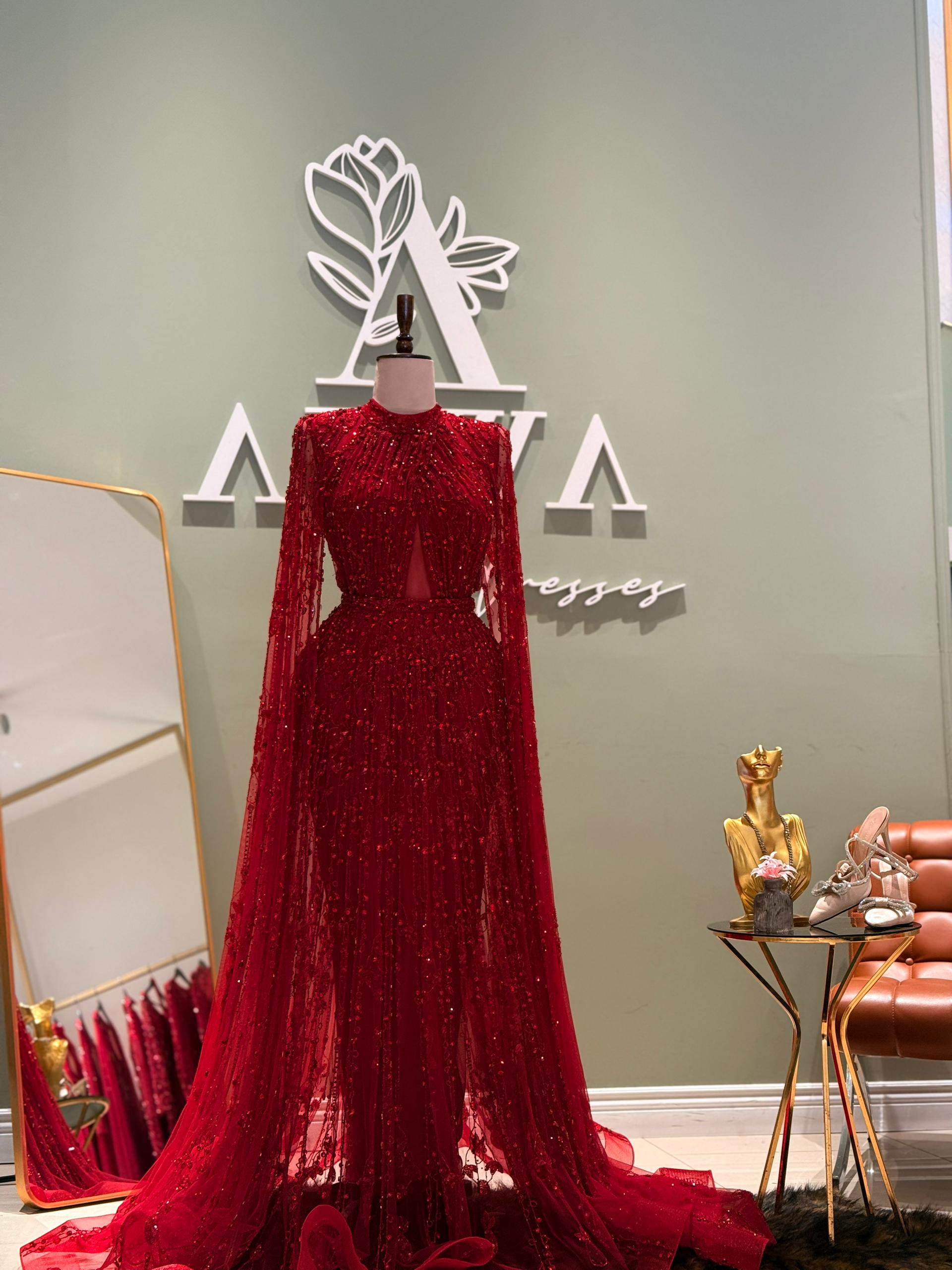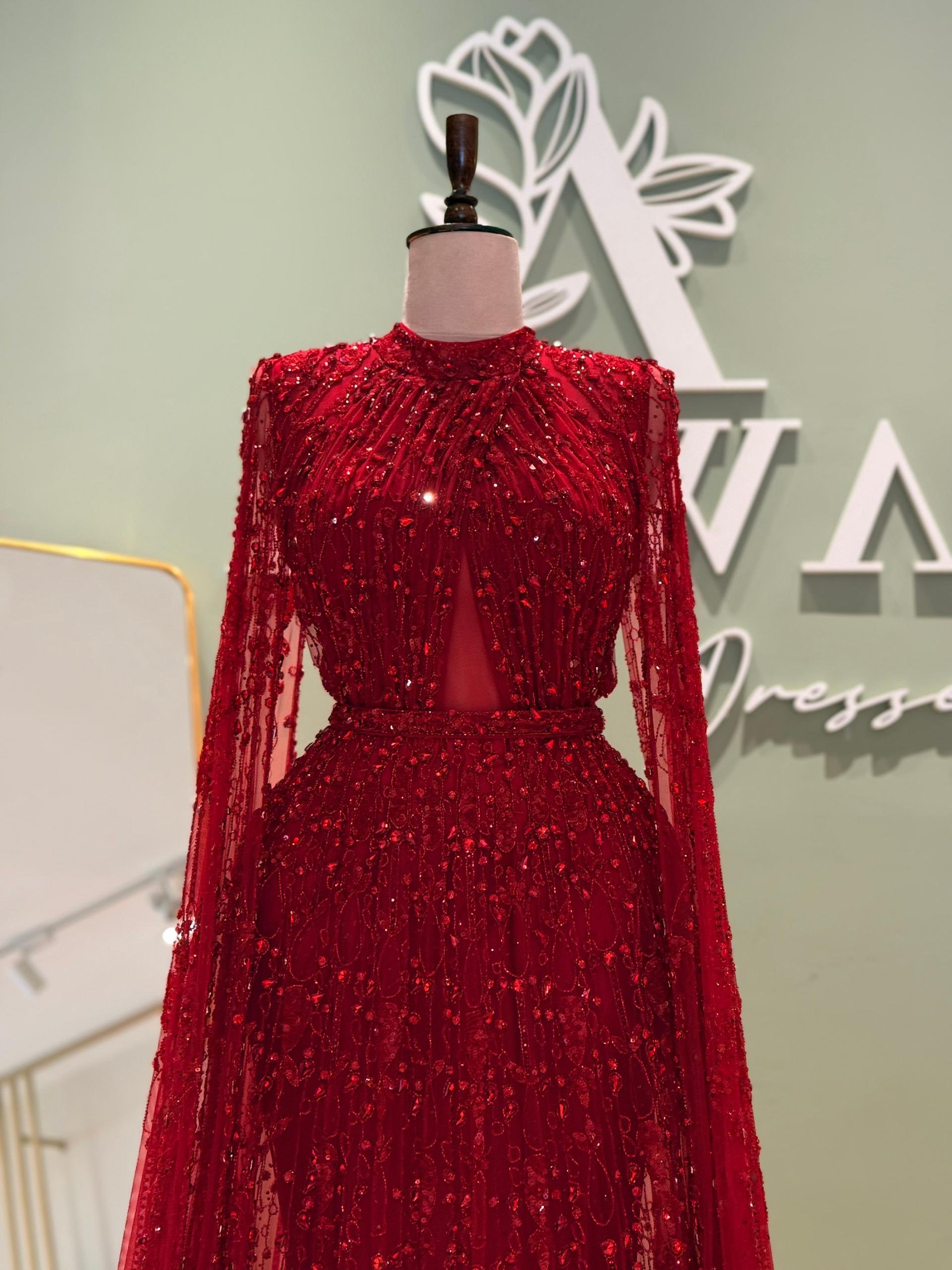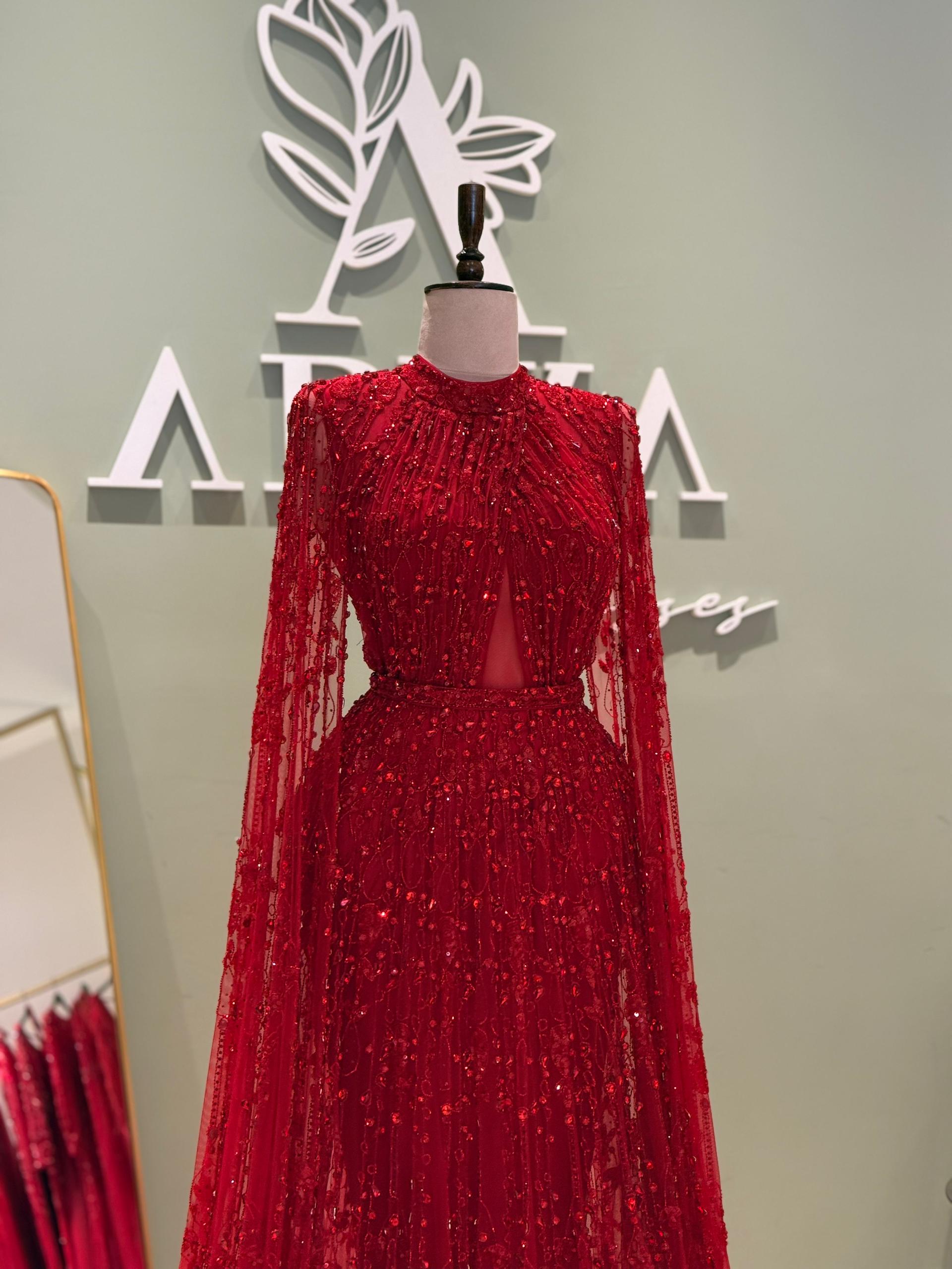 فستان سهرة فاخر بلون أحمر ياقوتي داكن يخطف الأنفاس، مزين بالكامل بتطريزات براقة من الأعلى إلى الأسفل.